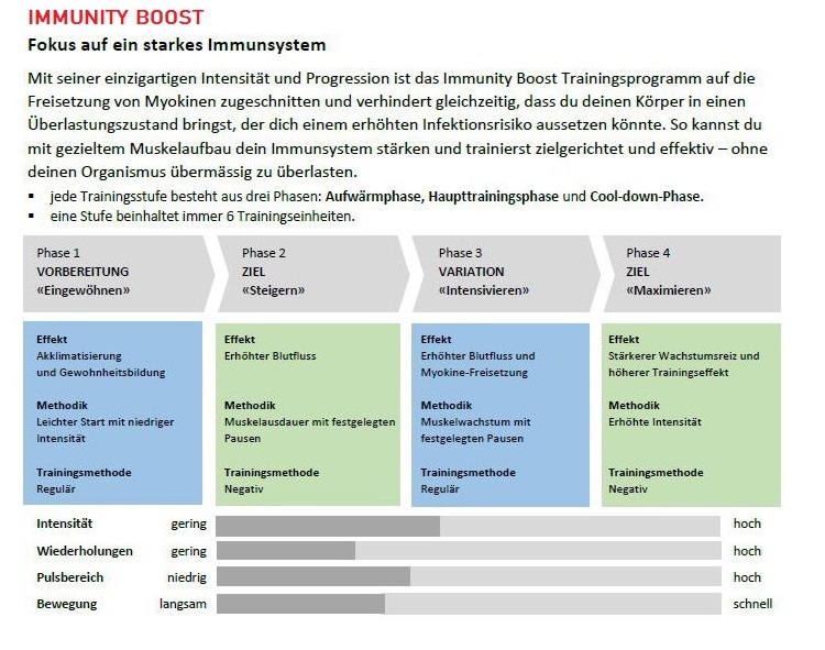 Während des Trainings produzieren deine Muskeln Botenstoffe, die so genannten Myokine. Myokine schützen dich vor Krankheiten denn sie sind sprichwörtlich die “Ladestation” deines Immunsystems. Das Immunity Boost Trainingsprogramm besitzt eine einzigartige Intensität bzw. Progression, um die Freisetzung der Myokine zu unterstützen. Gleichzeitig beugt es einer Überbelastung vor, die dich einem erhöhten Risiko aussetzen könnte. Auf diese Weise tragen deine Muskeln zu einem starken Immunsystem bei.